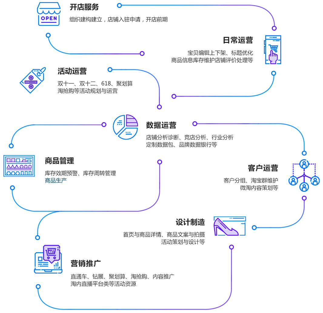 提供电商运营解决方案的服务商;也是淘宝,天猫等认证的官方精选服务商; 基于新零售的理念下,利用全面的大数据分析,全方位的品牌电商运营策划
